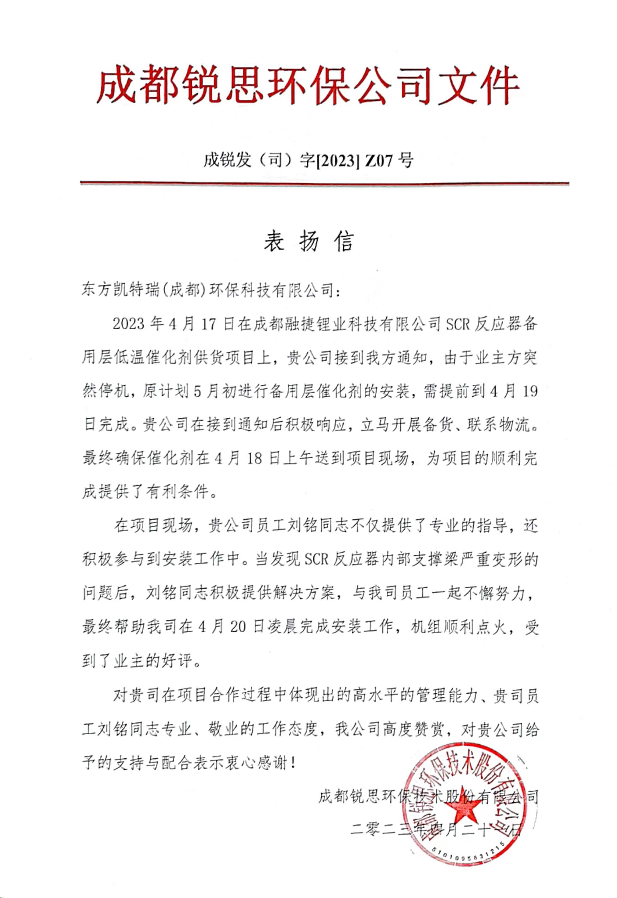 本次任務的圓滿完成,充分體現了我公司一切急用戶急,全力為用戶排憂解難的24小時服務精神。項目合作方和業主對東方凱特瑞在項目合作中展現的高水平管理能力和項目團隊專業、敬業且負責的工作態度給予了高度贊揚,并發來表揚信表示感謝。