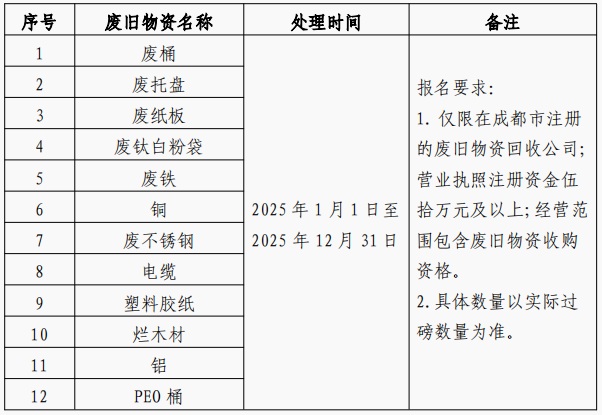 東方凱特瑞(成都)環保科技有限公司現有以下報廢物資進行銷售,擬邀請具有廢舊物資收購資質的法人單位投標,物資類別如下:
