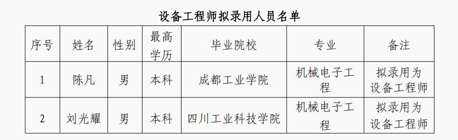 根據公司人力資源需求計劃及《人力資源管理制度》規定,經個人報名及公司考核,現將東方凱特瑞(成都)環保科技有限公司設備工程師擬錄用人員予以公示。