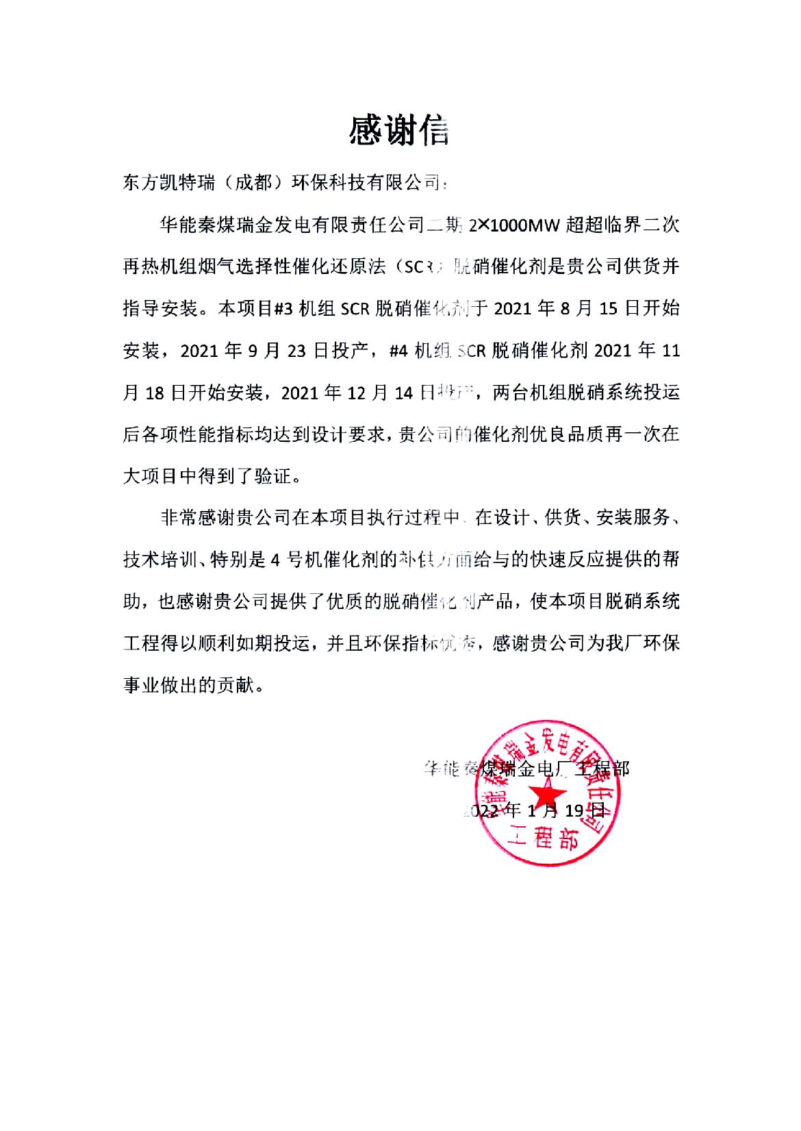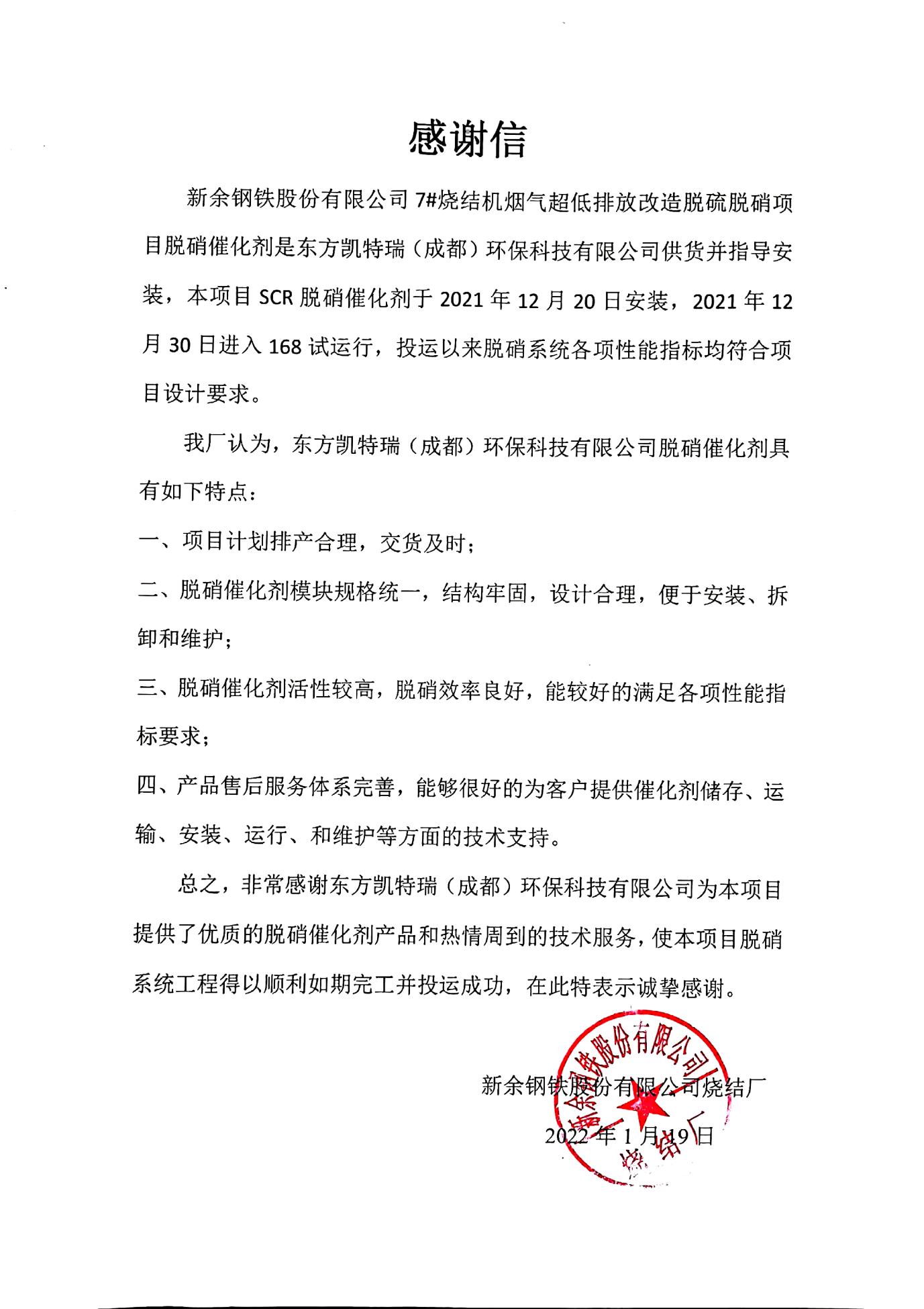 新年伊始,東方凱特瑞項目執行喜獲用戶好評,連續收到新余鋼鐵、華能瑞金等用戶發來的感謝信,對東方凱特瑞優良的產品品質、精準的排產交貨、專業的運維技術支持及真誠的服務給予了充分的肯定和認可。
