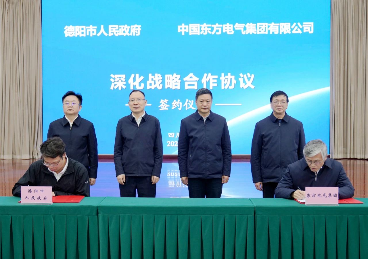 俞培根、李文清等領導共同見證了簽約儀式。簽約儀式分兩輪進行,第一輪中國東方電氣集團有限公司與德陽市人民政府簽署《深化戰略合作協議》;第二輪東方電氣風電股份有限公司與德陽發展控股集團有限公司簽署《戰略合作協議》。根據協議內容,雙方將發揮各自資源優勢,共同推動東方電氣集團在德陽布局和發展更多產業,助力德陽加快建設世界級清潔能源裝備制造基地。