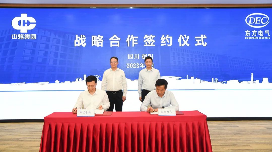 在東方電氣集團黨組書記、董事長俞培根,中煤集團黨委書記、董事長王樹東的見證下,東方電氣集團黨組成員、副總經理孫國君,中煤集團黨委常委、副總經理倪嘉宇分別代表雙方簽字。