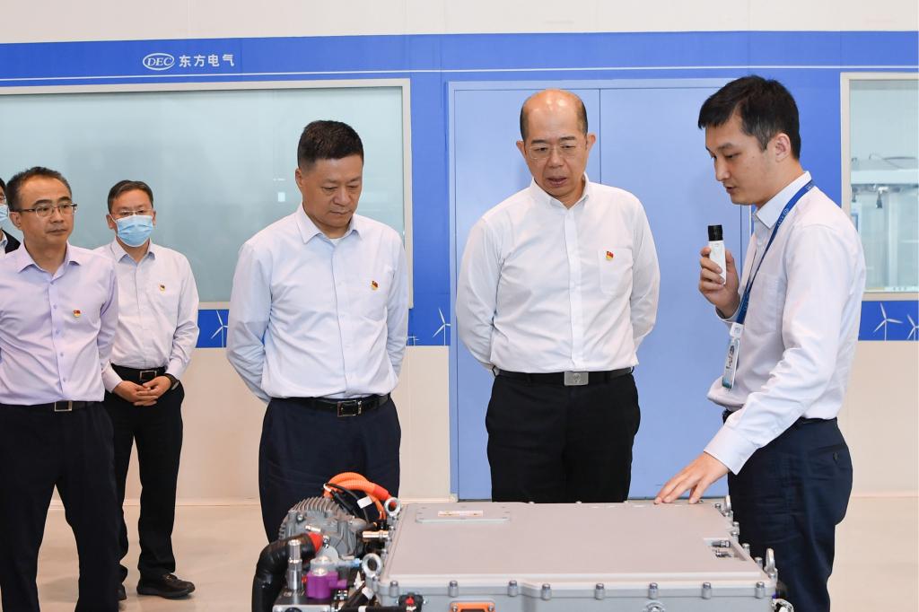 在東方電氣集團總部,譚作鈞一行深入氫燃料電池示范生產線,乘坐搭載“東方芯”的氫能公交車,參觀了科技展示廳,開展了專題調研座談。