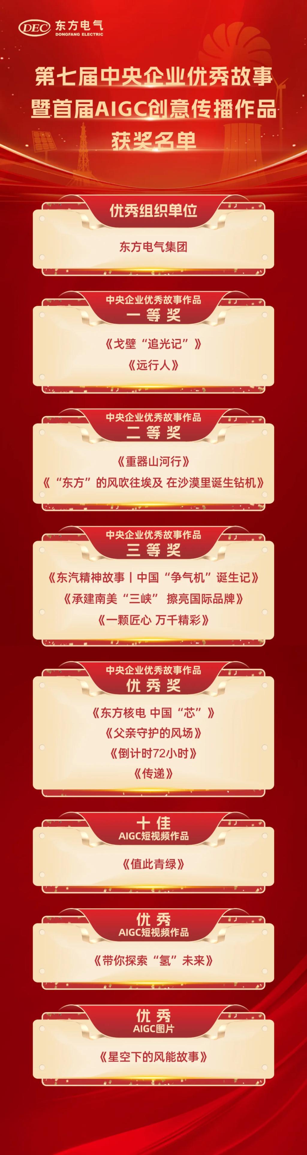 其中,《戈壁“追光記”》《遠行人》榮獲中央企業優秀故事作品一等獎,《重器山河行》《“東方”的風吹往埃及 在沙漠里誕生鉆機》榮獲中央企業優秀故事作品二等獎,《東汽精神故事丨中國“爭氣機”誕生記》《承建南美“三峽”擦亮國際品牌》《一顆匠心 萬千精彩》榮獲中央企業優秀故事作品三等獎,《東方核電 中國“芯”》《父親守護的風場》《倒計時72小時》《傳遞》榮獲中央企業優秀故事作品優秀獎,《值此青綠》獲評十佳AIGC短視頻作品,《帶你探索“氫”未來》獲評優秀AIGC短視頻作品,《星空下的風能故事》獲評優秀AIGC圖片。 活動期間,嘉賓們還參觀了首屆中央企業AIGC創意傳播成果展,東方電氣集團打造的“能源智造 擎動世界”主題展臺受到關注,集中展出了東方電氣集團綠色智造、AI高端裝備制造的創新形象。