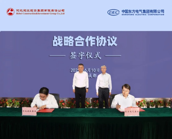 6月10日,中國東方電氣集團有限公司與河北建設投資集團有限責任公司在成都簽署戰略合作協議。東方電氣集團總經理、黨組副書記張彥軍和河北建投集團總經理、黨委副書記曹欣出席簽約儀式,東方電氣集團黨組成員、副總經理李建華,河北建投集團副總經理秦剛分別代表雙方簽署協議。